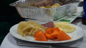Lunch included corned beef, potatoes, cabbage, fresh rolls, butter, and traditional accompaniments, catered by Tuscan Brands Artisan Catering