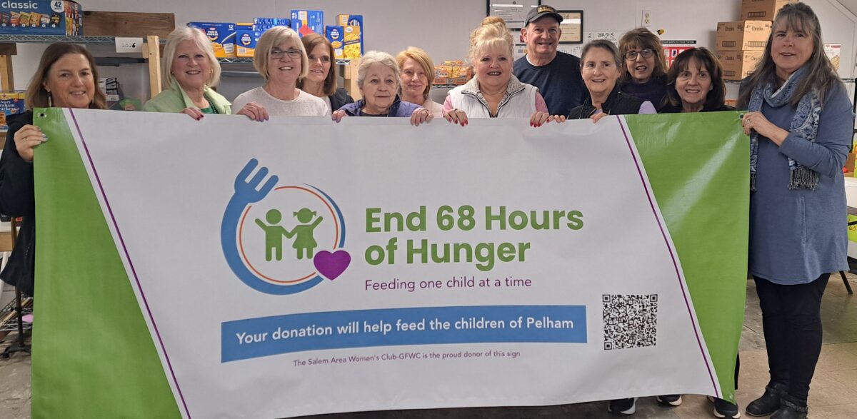 In March, SAWC members presented a handsomely designed banner to the End 68 Hours of Hunger organization in Pelham. Volunteers meet weekly to assemble food bags for children facing food insecurity over weekends when school meals are unavailable. The banner will be displayed at Pelham Old Home Days and other community events to raise awareness.
