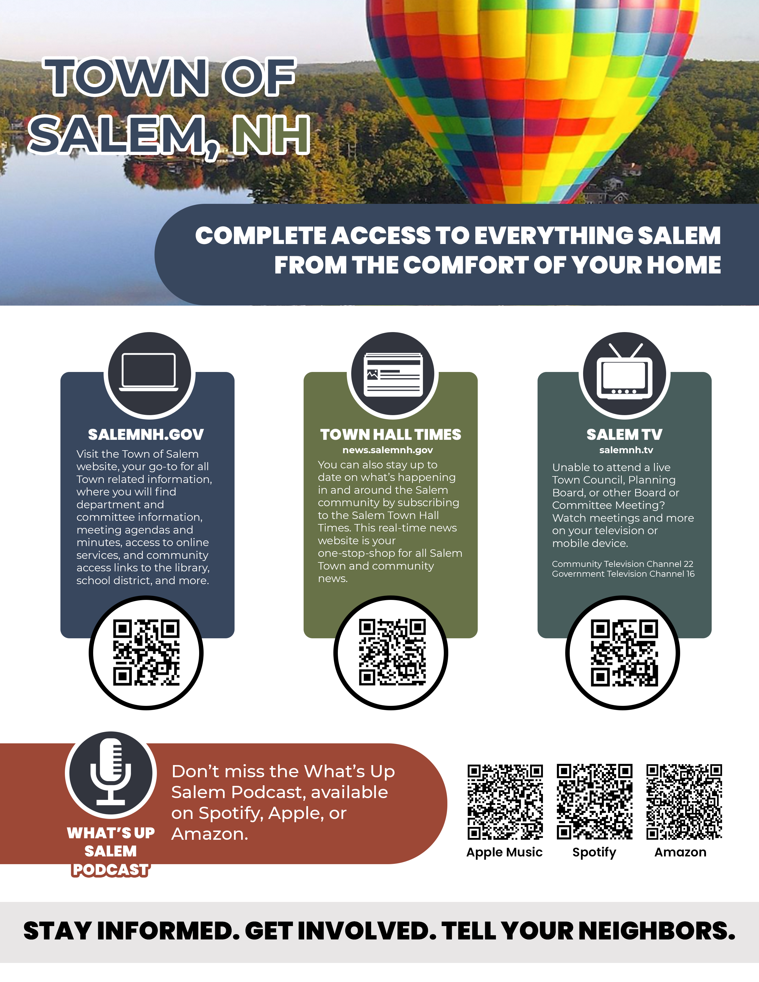 From the Town Hall Times and What’s Up Salem podcast, to the Town website and SCTV website, you can be sure to stay up to date on what is happening in our community. The Communications Committee meets the first Thursday of every month at 5pm in the Knightly Meeting Room of Town Hall. The Committee invites the public to join live or watch the livestream or video recording on SCTV. (Note: Dates are subject to change. Please check the Town website for updates: Communications Committee | Salem, NH (salemnh.gov))