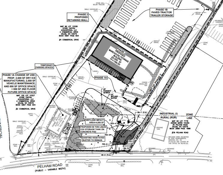 - Suraj Realty, LLC Site Plan – Amended site plan and phasing for office, vehicle maintenance and dry ice manufacturing building, warehouse / storage building, and paved tractor trailer storage area with CUP for reduced wetland setback at 44 Pelham Rd