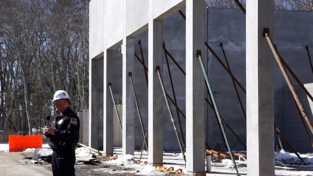 Are you curious to see how the inside of the Police Station is progressing? Salem NH Police Department Chief Joel Dolan takes us on a tour of the new police station. We see the outbuilding, animal control office, booking area, sally port and the 2nd floor. Most of the outside structures are all framed and the inside has steel beams and concrete walls.