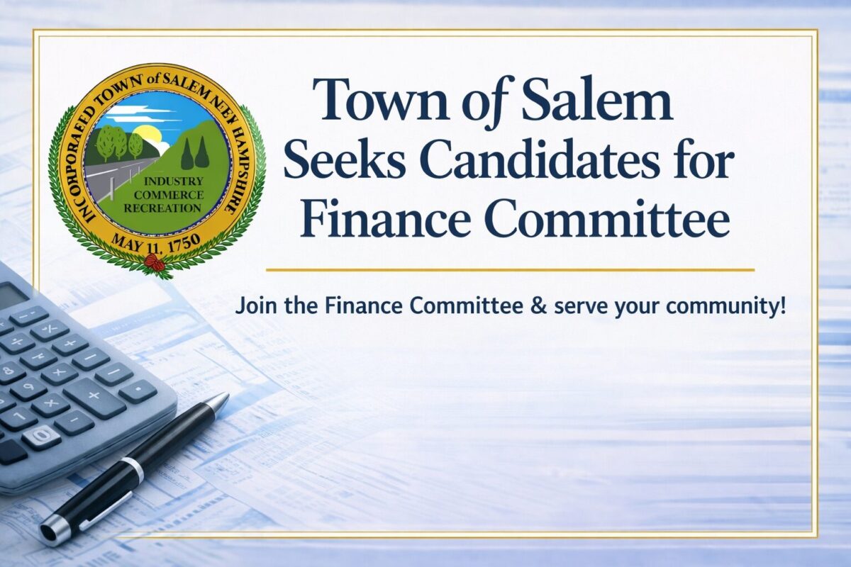 Interested residents wishing to serve on the Finance Committee are encouraged to submit their resumes, along with a letter of interest, to townmanager@salemnh.gov by Tuesday, May 5, 2026. Following the review process, candidates will be invited to interview with the Town Council at an upcoming Town Council meeting.